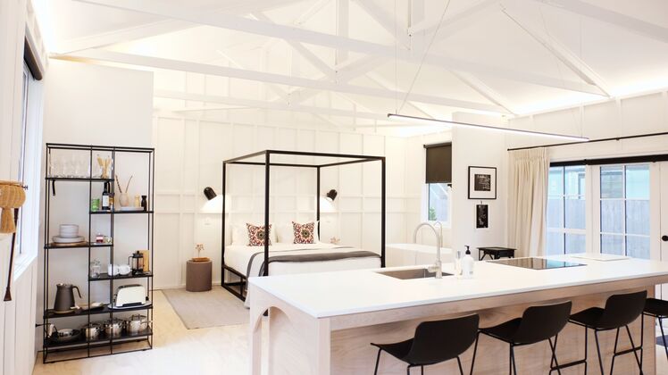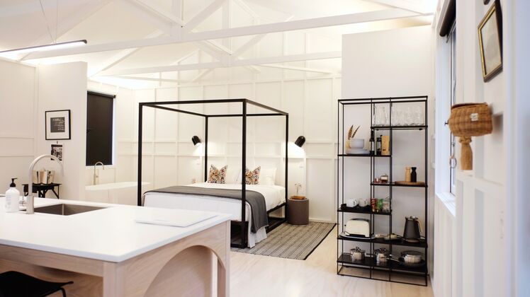 Both pavilions are light and spacious with original gable ceilings and full-length windows. In each pavilion there is a central island with a full kitchen, which also doubles as an ideal working space, and the lounge area has an entertainment suite. The master beds are custom-made, and sit alongside a free-standing bathtub right there in your bedroom. The tiled bathroom has an open shower, underfloor heating and Crimson and Co bathroom amenities.